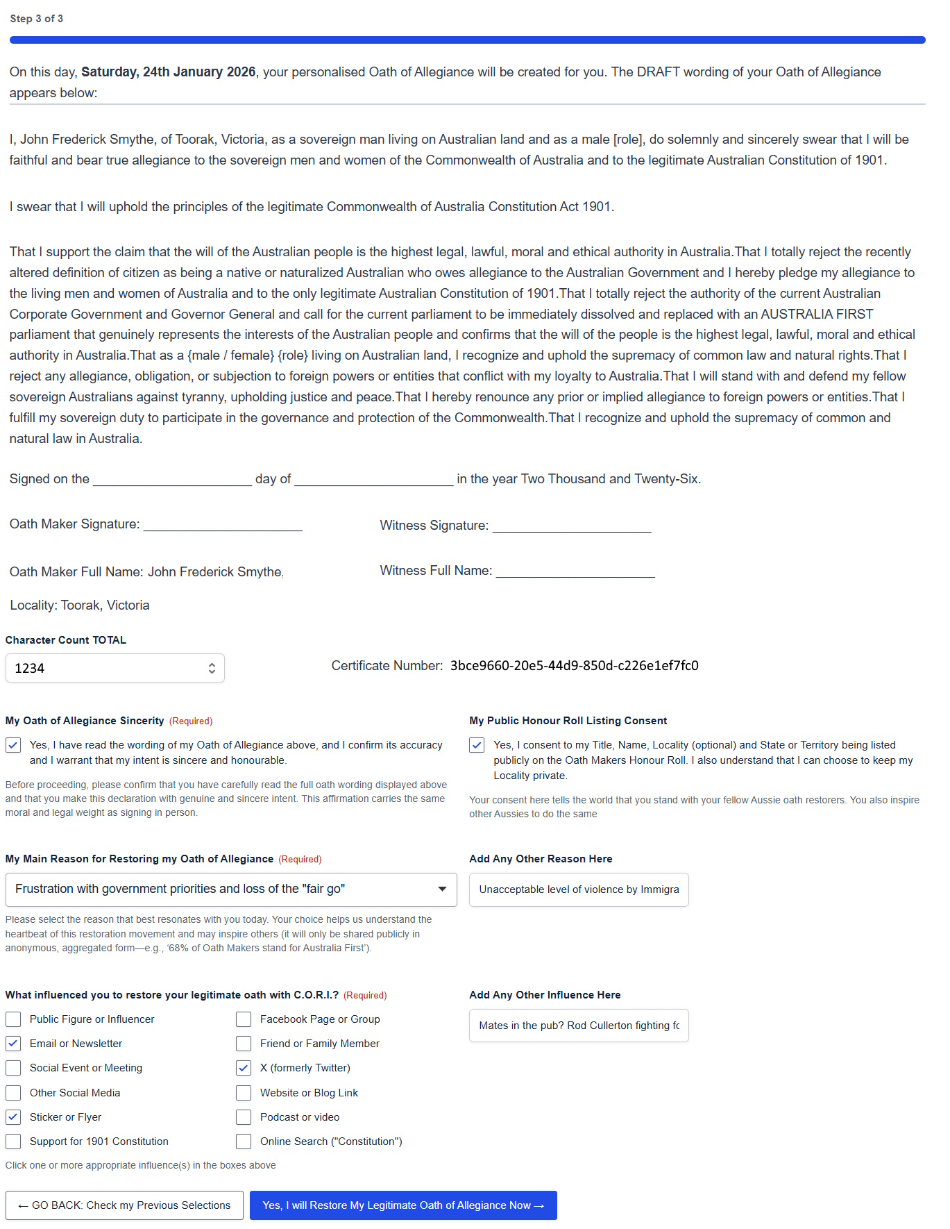 This page is a STATIC COPY of the Oath of Allegiance Submission form – STEP 3 of 3. The image on this page is intended for reference purposes only, to help you understand the flow of the Oath Making Process. It cannot be used for making your Oath of Allegiance submission. The active form for submissions is located here.